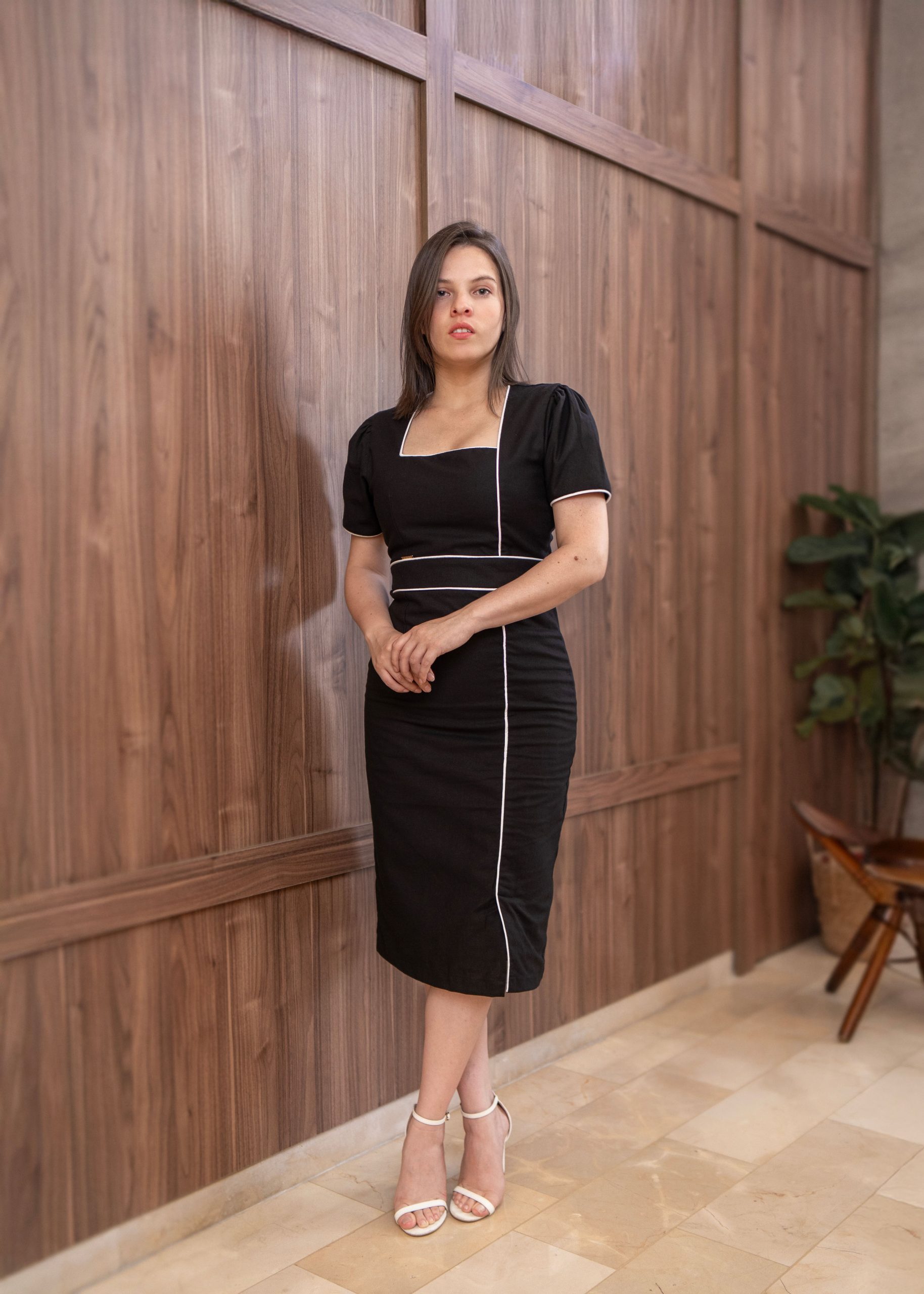 VESTIDO MIDI CON ESCOTE CUADRADO, MANGAS ABULLONADAS Y SILUETA AJUSTADA QUE REALZA LA FIGURA.