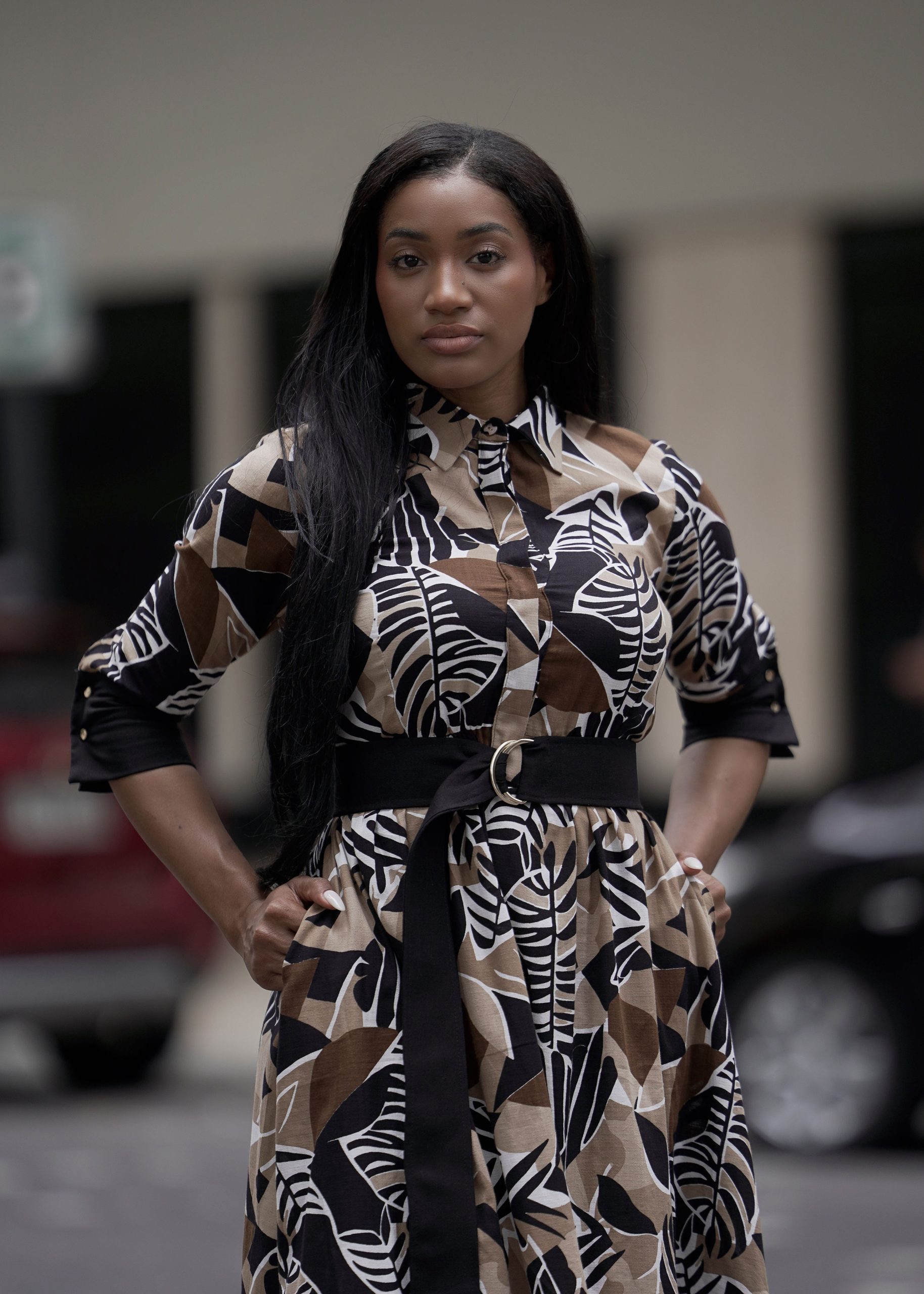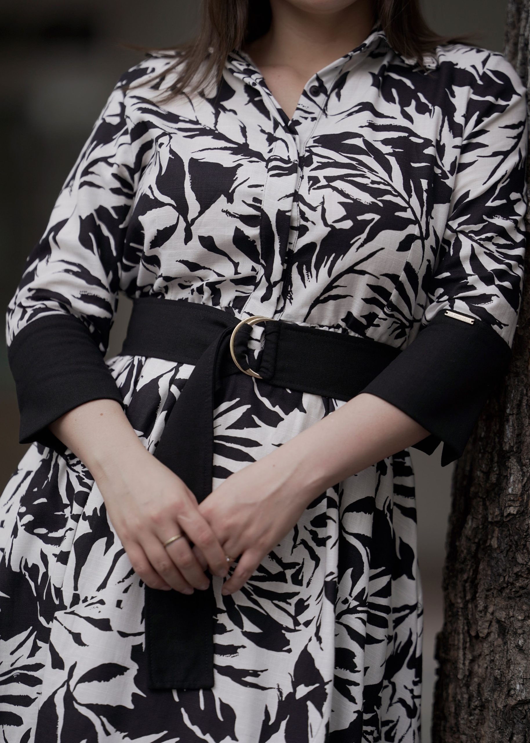 Vestido camisero midi en lino 100% que aporta frescura y estructura. El cinturón de tela con hebilla metálica marca la cintura y equilibra tu silueta, mientras el estampado botánico añade elegancia e identidad.
