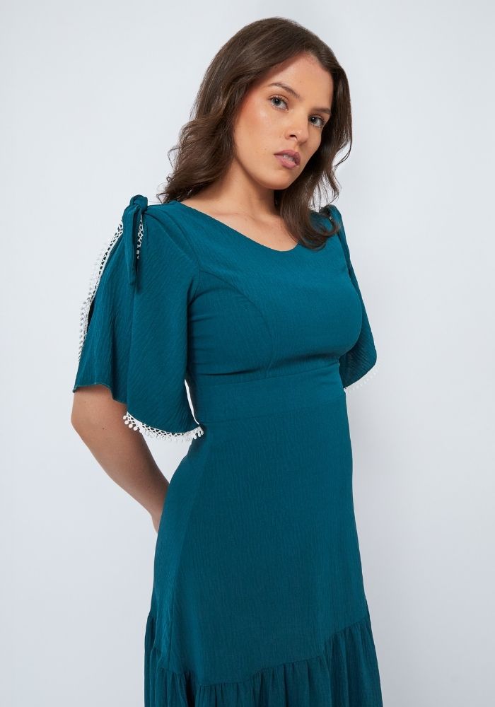 CUELLO REDONDO MANGAS CAMPANAS CON DECORACIONES EN CXINTA BORDADA VESTIDO FORRADO