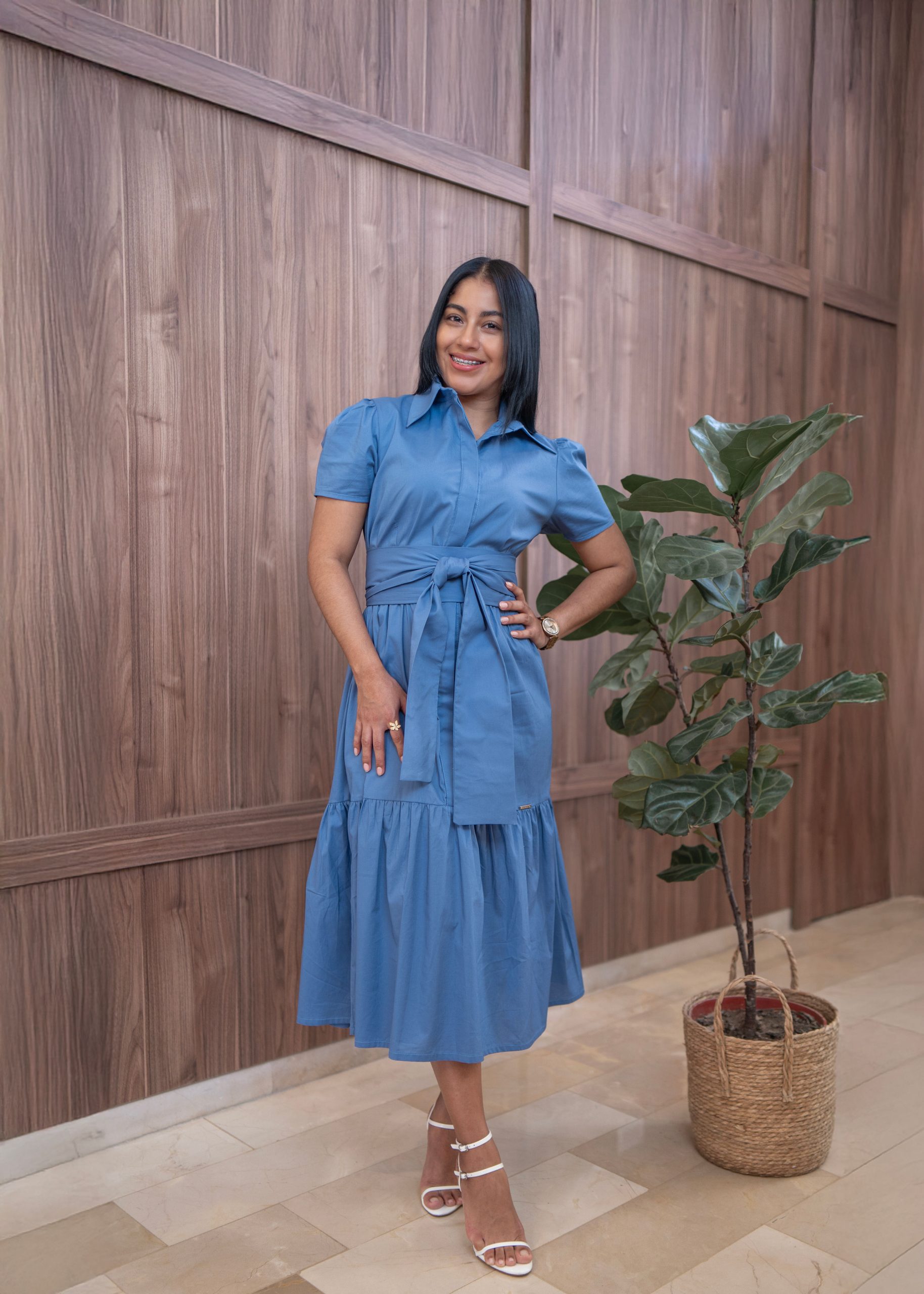 VESTIDO EN TEJIDO SEMINATURAL CON LAZO EN CINTURA Y FALDA AMPLIA DE CORTES DELICADOS.