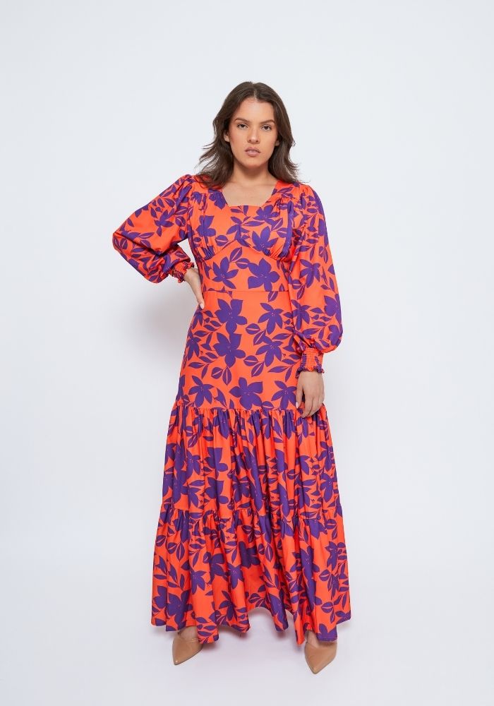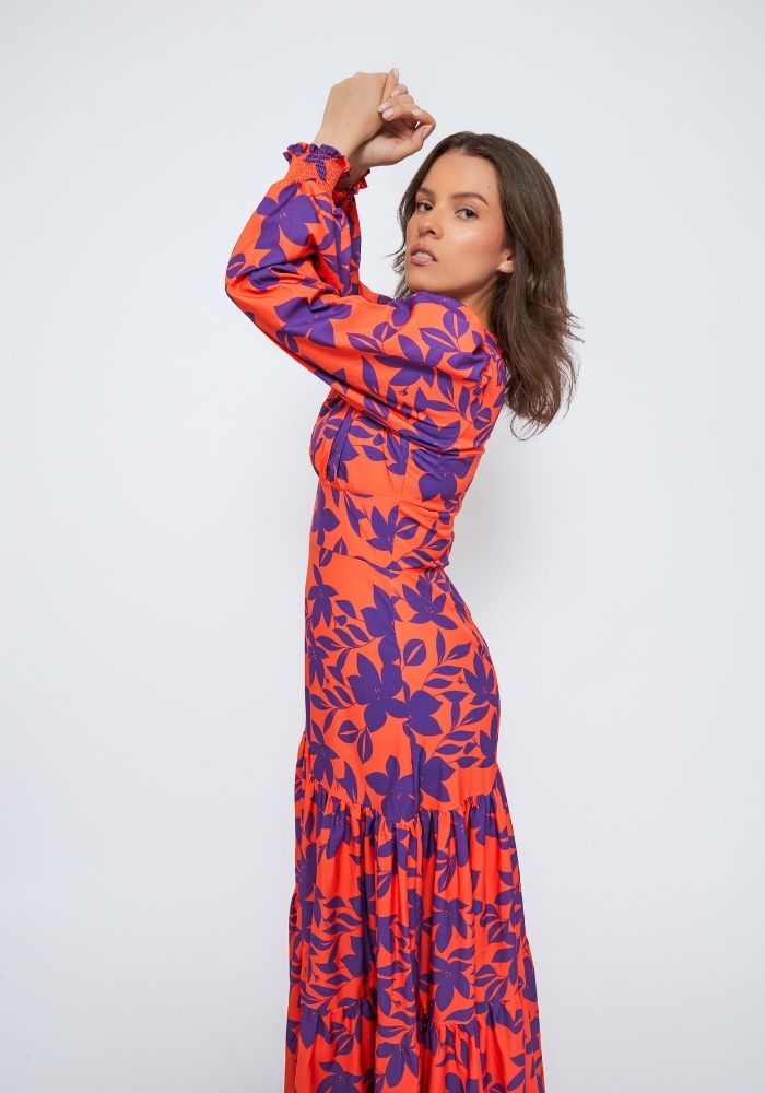 BLUSA SILUETA ENTALLADA,FALTA SILUETA AMPLIA A DOS TIEMPOS,MANGAS LARGAS CON PUÑO ELASTICO ( NIDO DE ABEJA) CUELLO EN V CON VISTA INTERNA LIMPIA ESTAMPADO FLORAL EN CONTRASTE ,PARTE INTERNA FORRADA